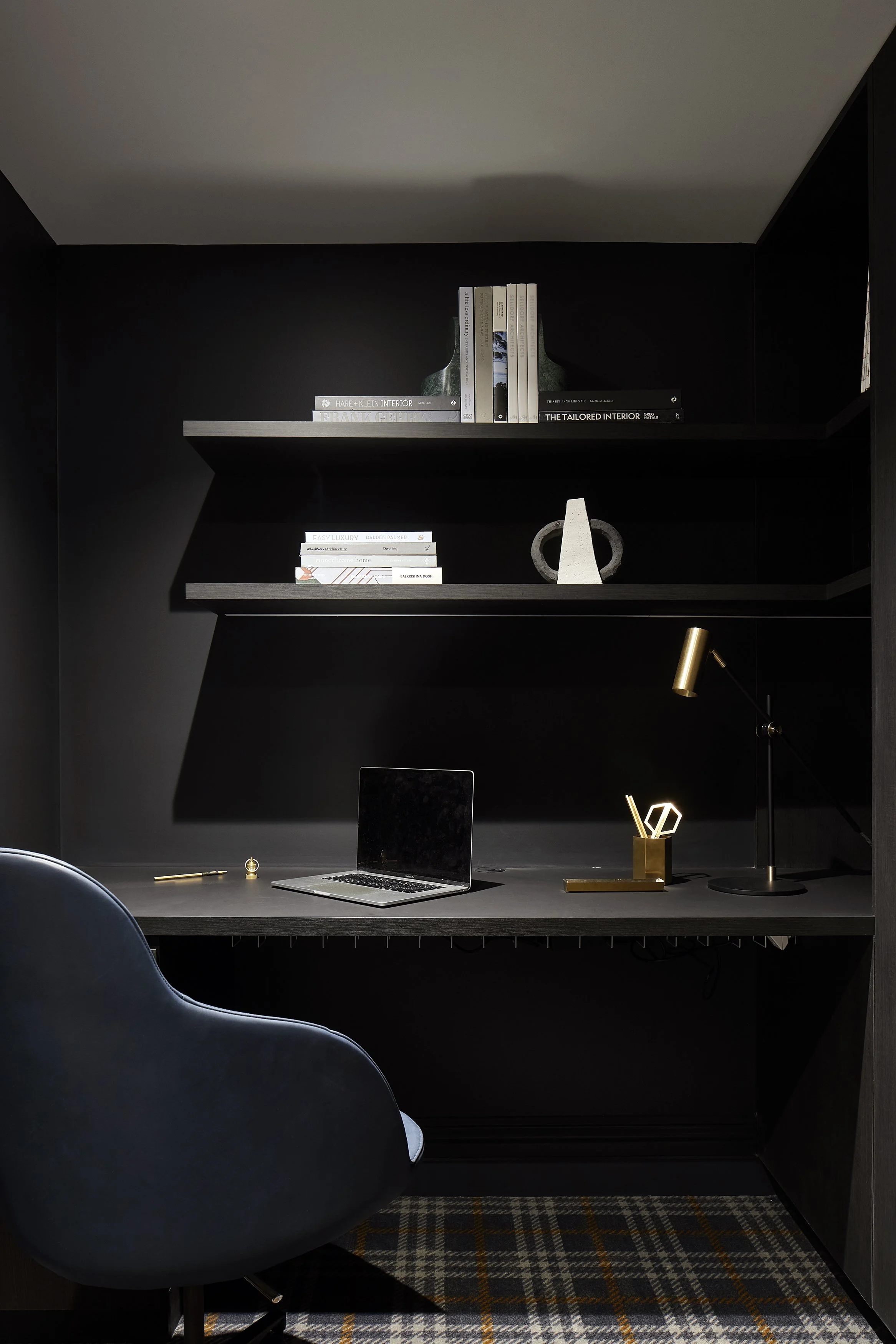 The interiors were fully renovated from a new staircase, a reworked layout to improve flow and function to creating more light throughout all the spaces. In the basement, we erected a new stud wall to delineate the garage from the rest of the house. We converted the three-car spot garage into two spots and a new and compact yet valuable office was created. Nestling the office next to the existing theatre, we embraced the moody environment with charcoal walls and ceiling together with a custom-designed tartan carpet.