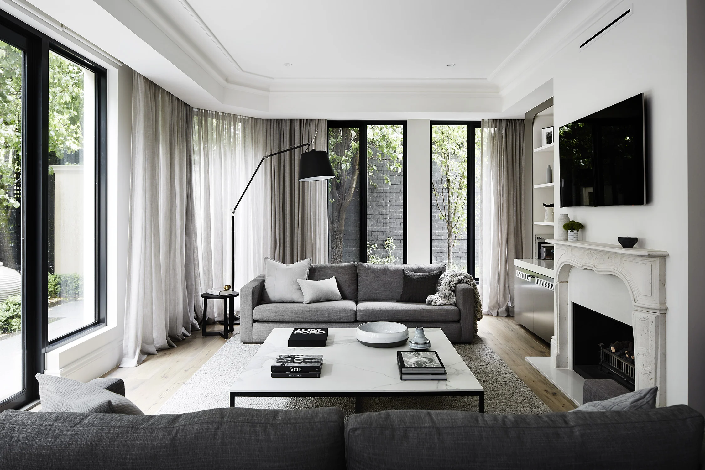 The brief for this project was to inject new life and energy - and design a comfortable, functional and calm space whilst still being gloriously glamorous and elegant. Considered joinery enhances a feeling of serenity by minimising clutter, and the interplay of tactile and matte finishes responds to the modern architecture. Bold, asymmetrical lines and sculptural elements create depth and drama while the neutral palette combination of charcoal, black, white and grey are accentuated with subtle elements of colour to lift the moodiness; a home that contemplates relaxation and sophistication.